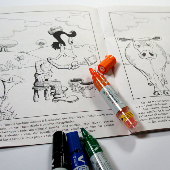 O fazendeiro tinha um trabalho danado, vivia esfolado, todo azuado, porque, além de ordenhar a vaca, dar comida aos porcos, recolher os ovos das galinhas, deixar a lagoa sempre limpa para os peixes e patos, ele ainda era pintor.